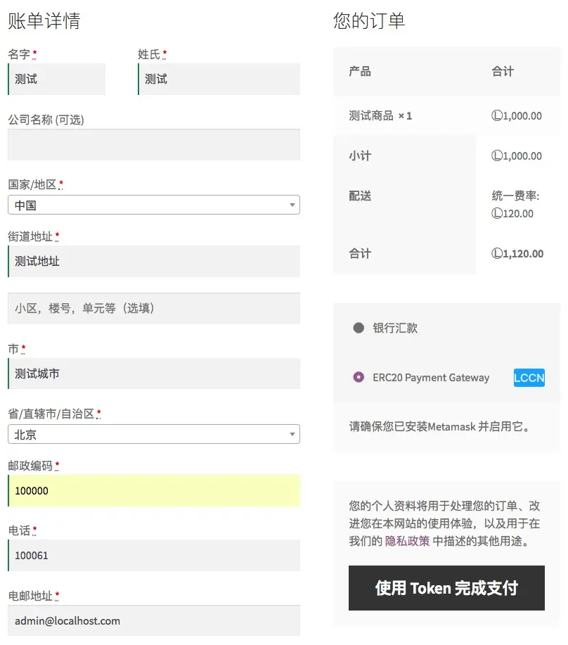输入账单地址(账单地址将作为收货地址显示在界面中),点击「使用 Token 完成支付」。