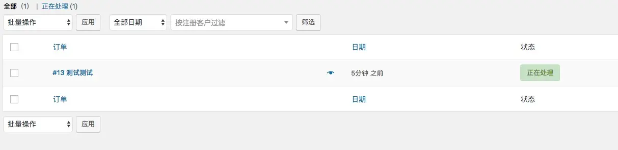 用户支付完成后,如何确定订单已经支付完成了呢?进入后台——「WooCommerce」——「订单」,可以看到用户所有的订单。
