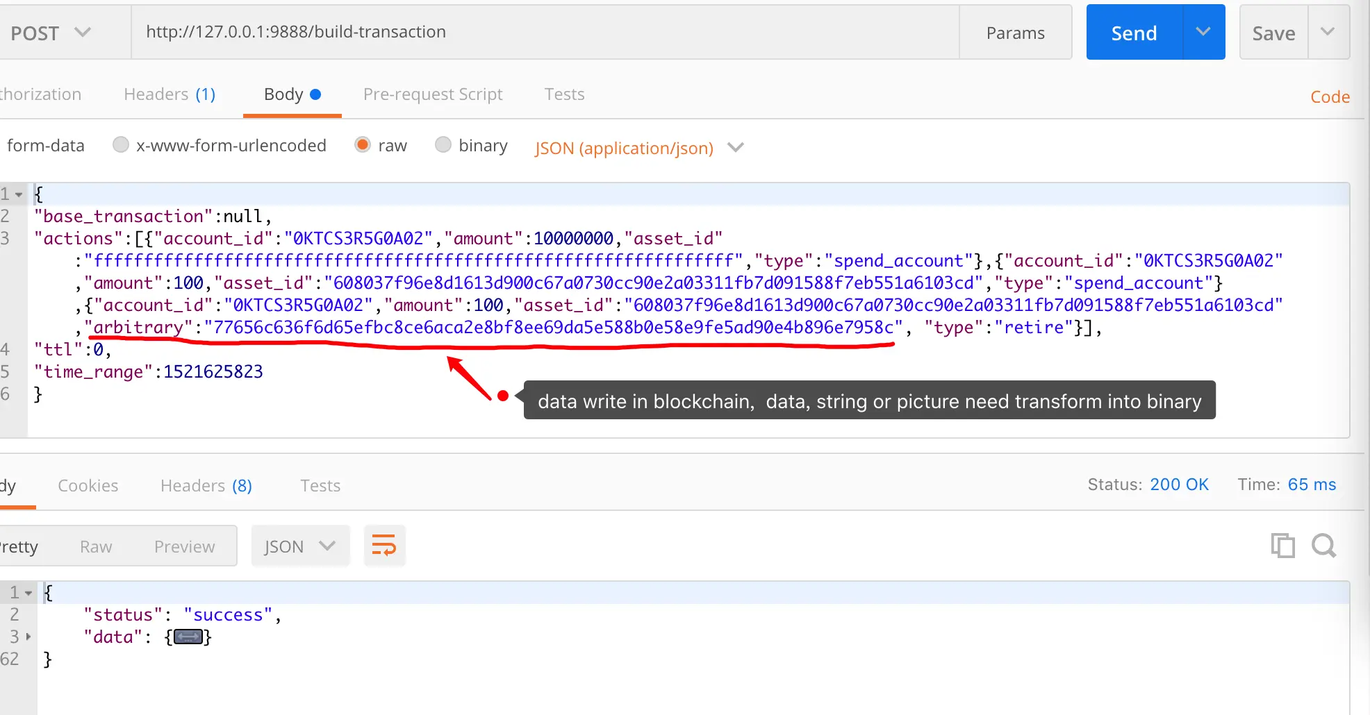 step3: 信息上链的本质就是其实就是创建并发送一笔交易,我们都知道通过api发起交易主要有三个步骤,先 build → sign → submit,分别对应的api是 build-transaction、sign-transaction、submit-transaction。用postman请求过程如下: