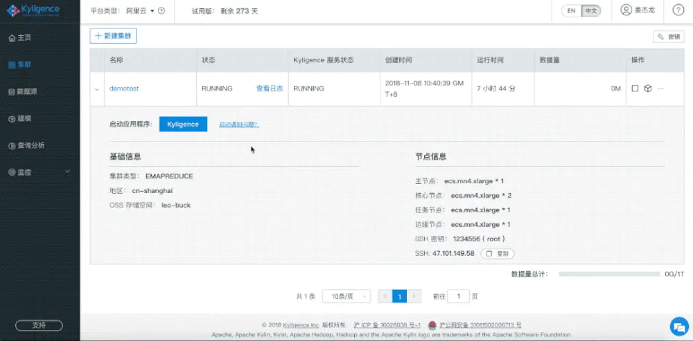 使用 Kyligence Cloud上在阿里云上成功部署大数据分析集群,详细步骤请参阅:Kyligence Cloud用户手册