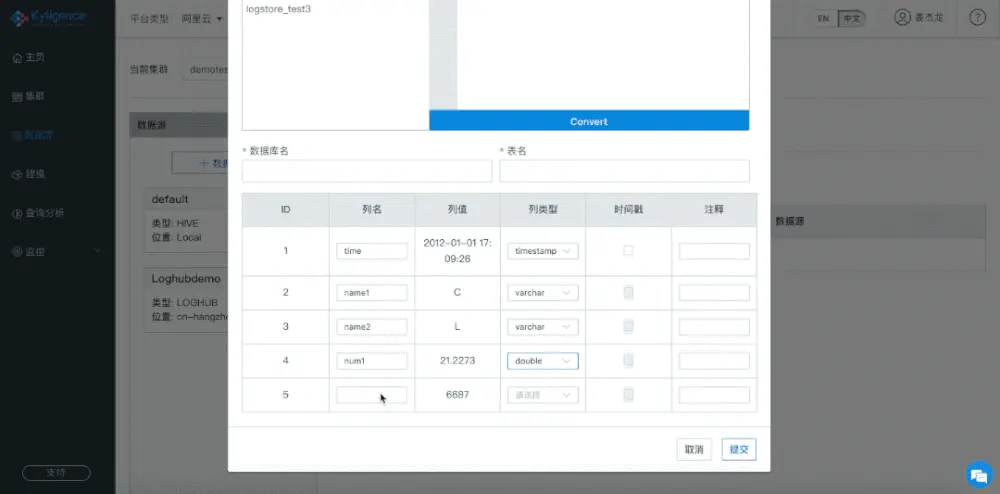 连接LogHub数据源后即可开始对LogHub构建表结构,LogHub日志服务大部分都是以CSV格式进行记录。在构建表结构时,CSV格式的流式数据没有所对应的列名、列类型。在 Kyligence Cloud 中构建LogHub表结构时以用户熟悉的表结构页面呈现,用户只需在每行列值前补充对应的列名,并选择该列值类型即可完成将LogHub日志流定义为事实表。