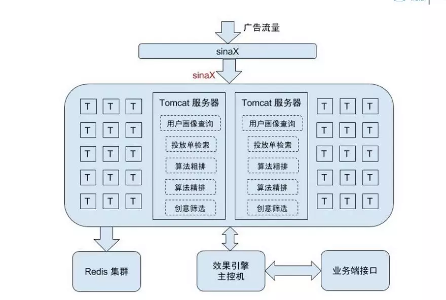 在最前面提到的技术架构图下方有着很多的投放引擎,上图就是引擎的具体实现。2014年的时候这些引擎都是基于tomcat服务器实现,包括用户画像查询、投放单检索、算法粗排等功能都在tomcat服务器上。