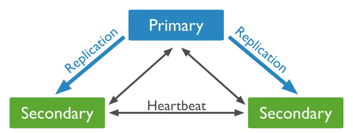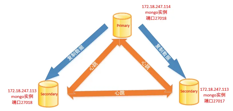 最小的副本集推荐架构为三成员集合,其中一个为primary,另外两个为secondary,secondary在一定情况下可以成为primary。