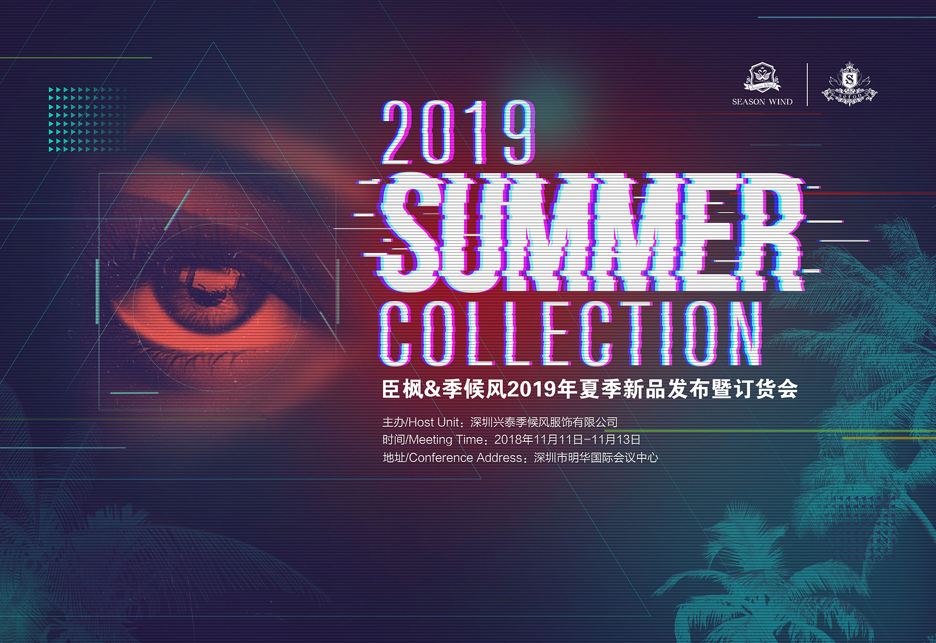 根据这样去做画面,素材左一,参考右一。他想要的是:字体不要太夸张,不要故障的太夸张的感觉。然后经过不停修改,改稿什么的比如说不要故障的太厉害了,不要抢视觉中心,眼睛融合的不够好等等就不细说了。最终定稿如下。做的过程中,除了眼睛是必要的(视觉中心),其他比如加入“夏天的植物”如椰子树,亮色暗色的搭配,加入几何图形让眼睛更集中,加入glitch线条点缀等等,都是可以自由发挥。
