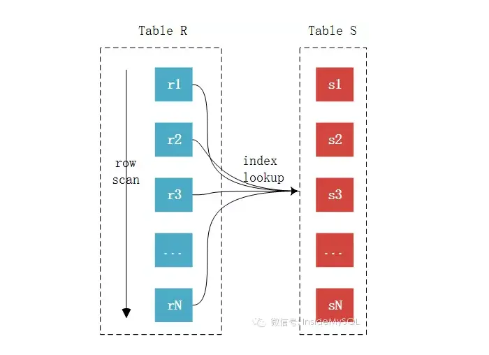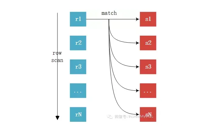 如下图,r为驱动表,s为匹配表,可以看到从r中分别取出r1、r2、......、rn去匹配s表的左右列,然后再合并数据,对s表进行了rn次访问,对数据库开销大