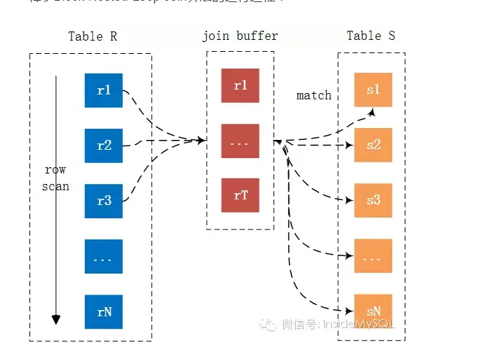 可以看到中间有个join buffer缓冲区,是将驱动表的所有join相关的列都先缓存到join buffer中,然后批量与匹配表进行匹配,将第一种多次比较合并为一次,降低了非驱动表(s)的访问频率。