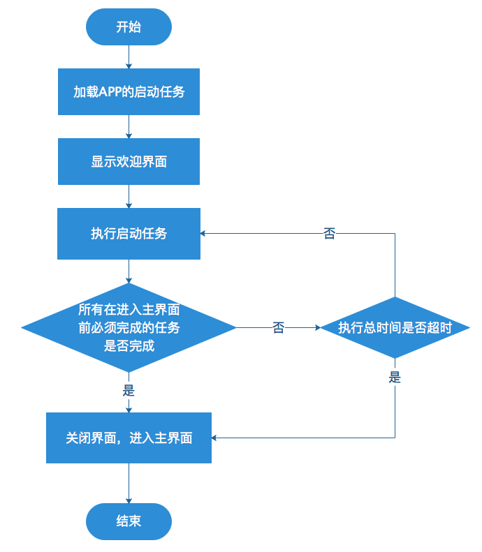 - APP启动时就执行启动任务并展示欢迎界面,所有进入主界面前必须完成的启动任务全部执行完毕后,关闭欢迎界面,进入主界面并加载主界面的UI和数据