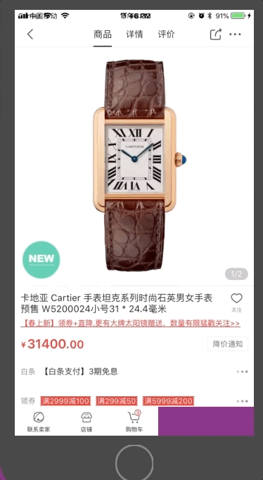 点击右下角紫色按钮(即"加入购物车"按钮), 即触发Presentation: 先设置toView(橙色视图)的frame, 并将toView平移到屏幕下方, 然后使用块动画让fromView(展示手表信息的视图)X方向上旋转 π / 16 度, Z方向上移动-100, 并恢复toView的transform为默认值. 在当前块动画完成的回调中嵌套一个块动画, 以实现fromView在X. Y方向上缩放为原先的0.9. 嵌套块动画的完成回调中, 调用UIView的扩展方法toRetinaImage() -> (UIImage)来绘制fromView, 将其添加到transitionContext的containerView第0层.并调用 transitionContext.completeTransition(true)告知转场结束.还有一个蒙版的细节,这个实现比较简单,直接添加在fromView和toView之间.