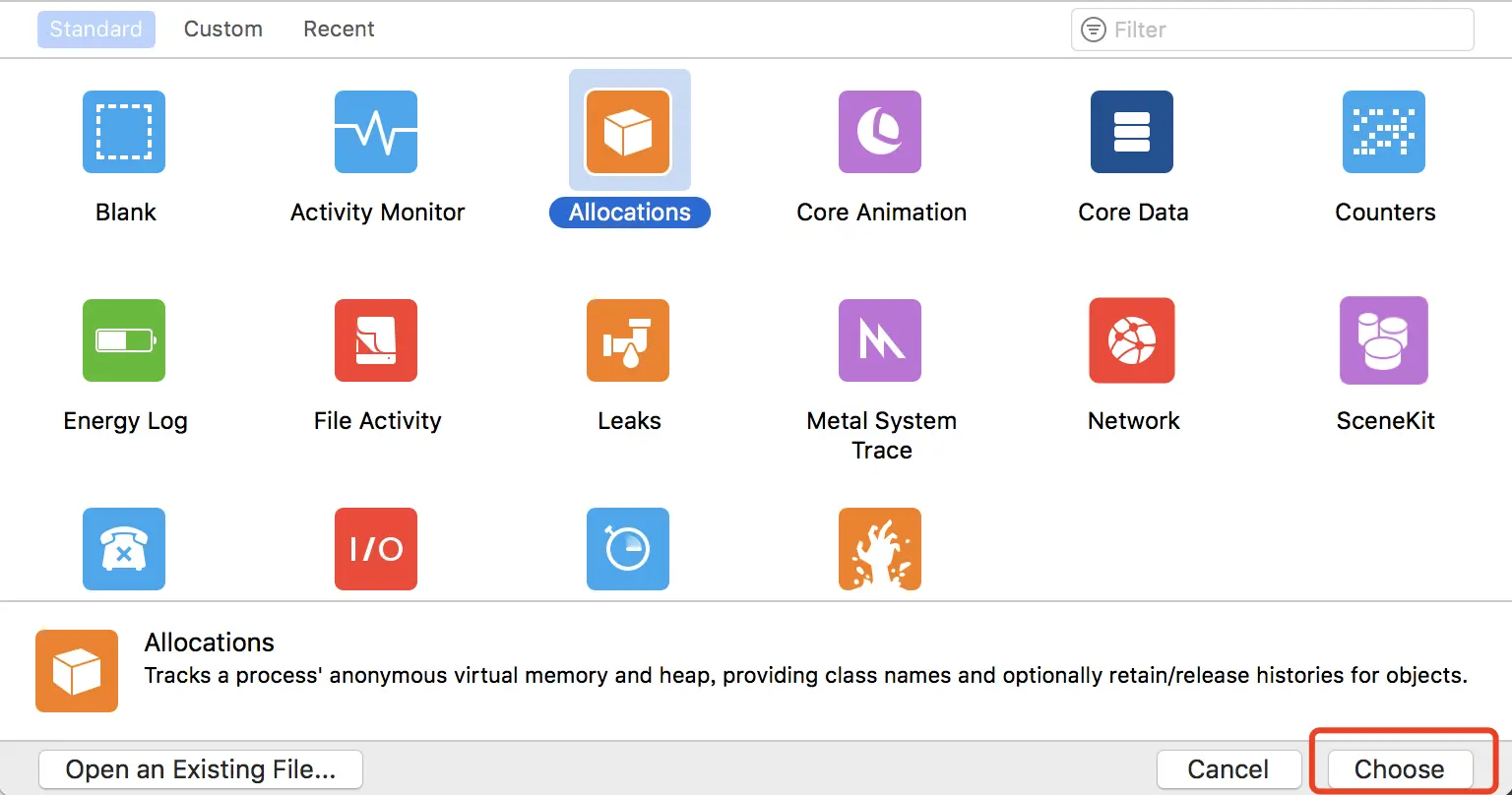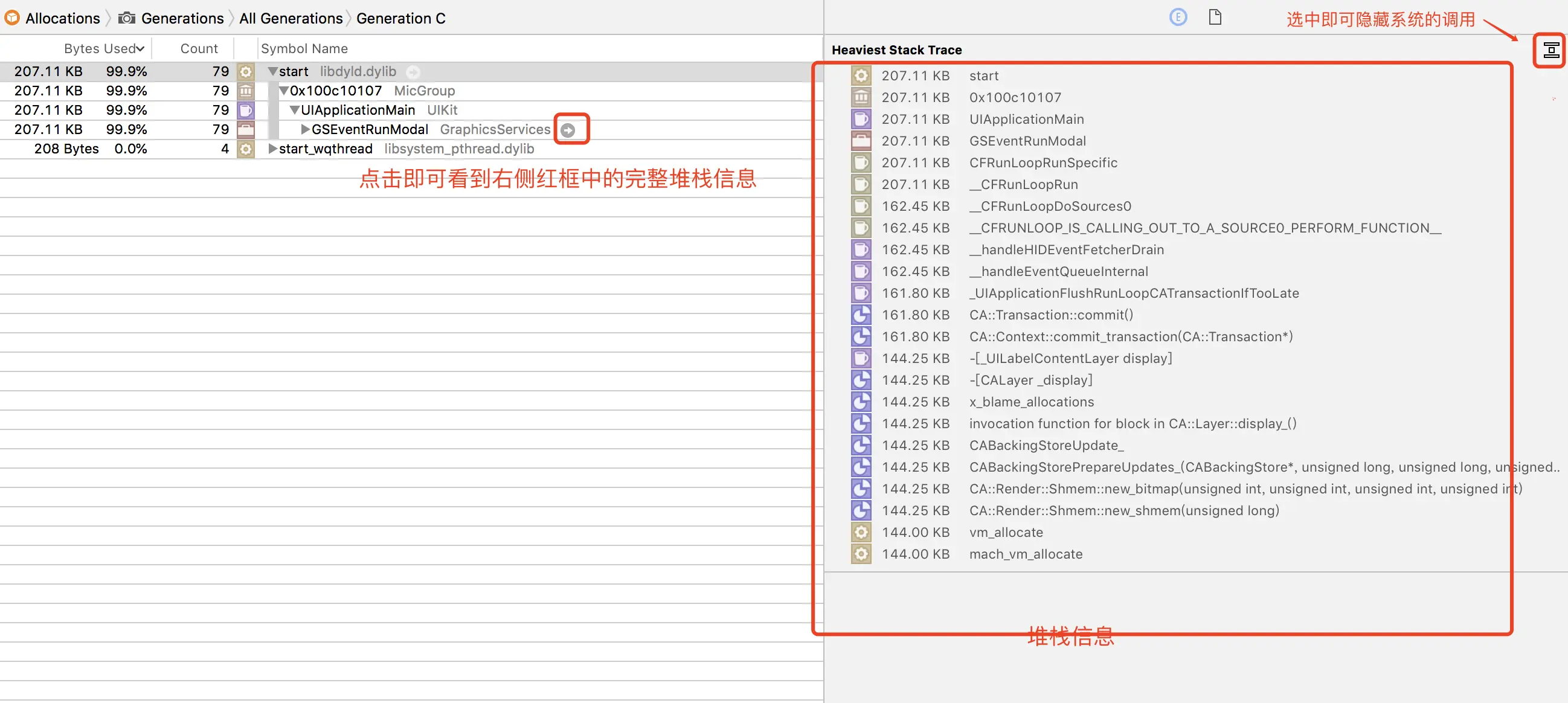 内存分配概要分析模版使用Allocations和VM Tracker工具来测量应用程序中常规和虚拟内存使用情况。但是,要追踪已分配但不再需要的废弃内存,要重点关注Allocations 工具.该工具测量堆内存使用情况并跟踪内存分配,包括按类分配的特定对象。