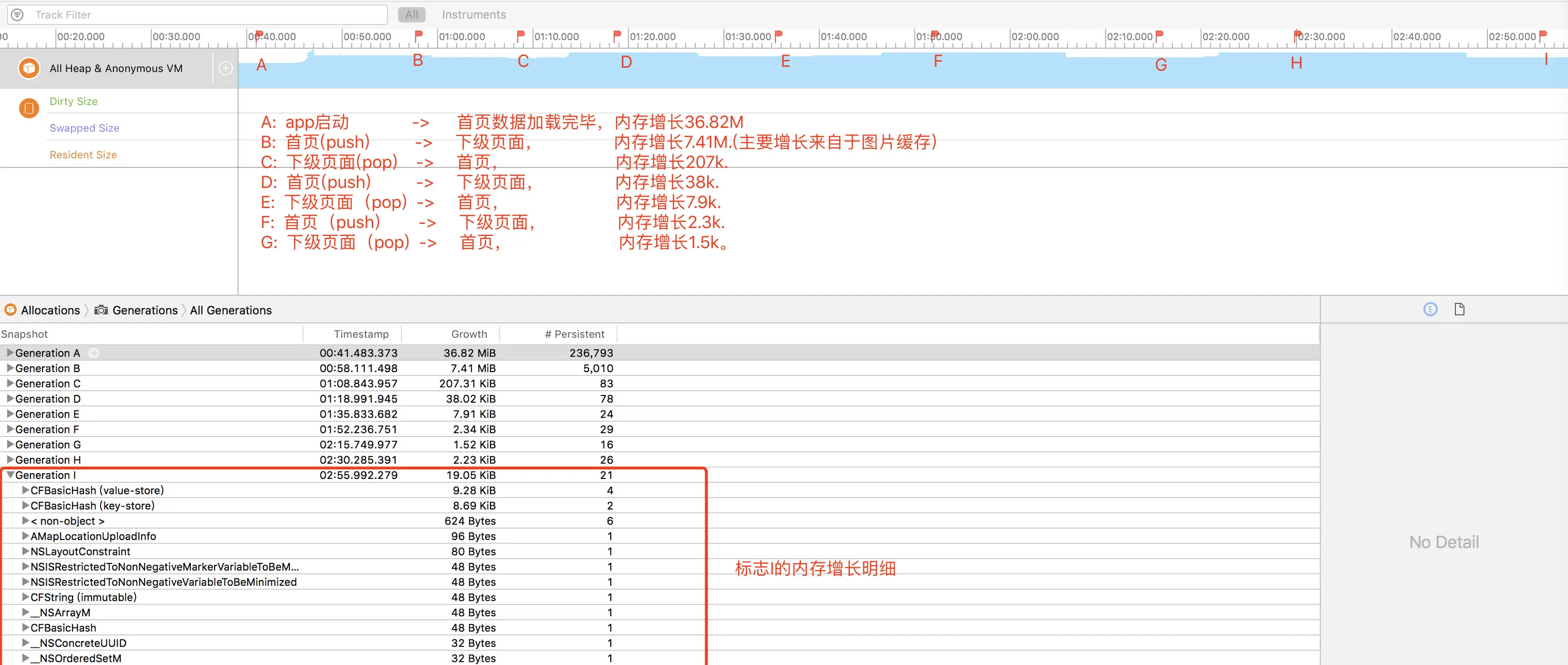 Growth 和 # Persistent 这两列分别告诉你从上一个标志到当前标志的这个过程中有多少内存增长和内存分配。如果你的app回到了一个操作的初始状态,你不应该期望增长的内存从一个标志积累到下一个标志。