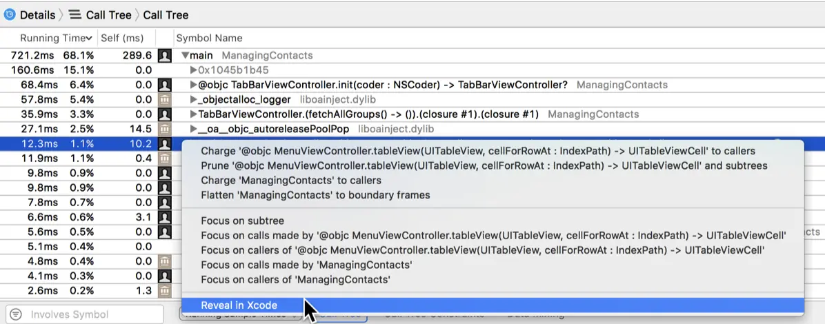15.点击详情面板中的条目并按住control键,在弹出窗口中选择Xcode中的Reveal以在Xcode中显示源.
