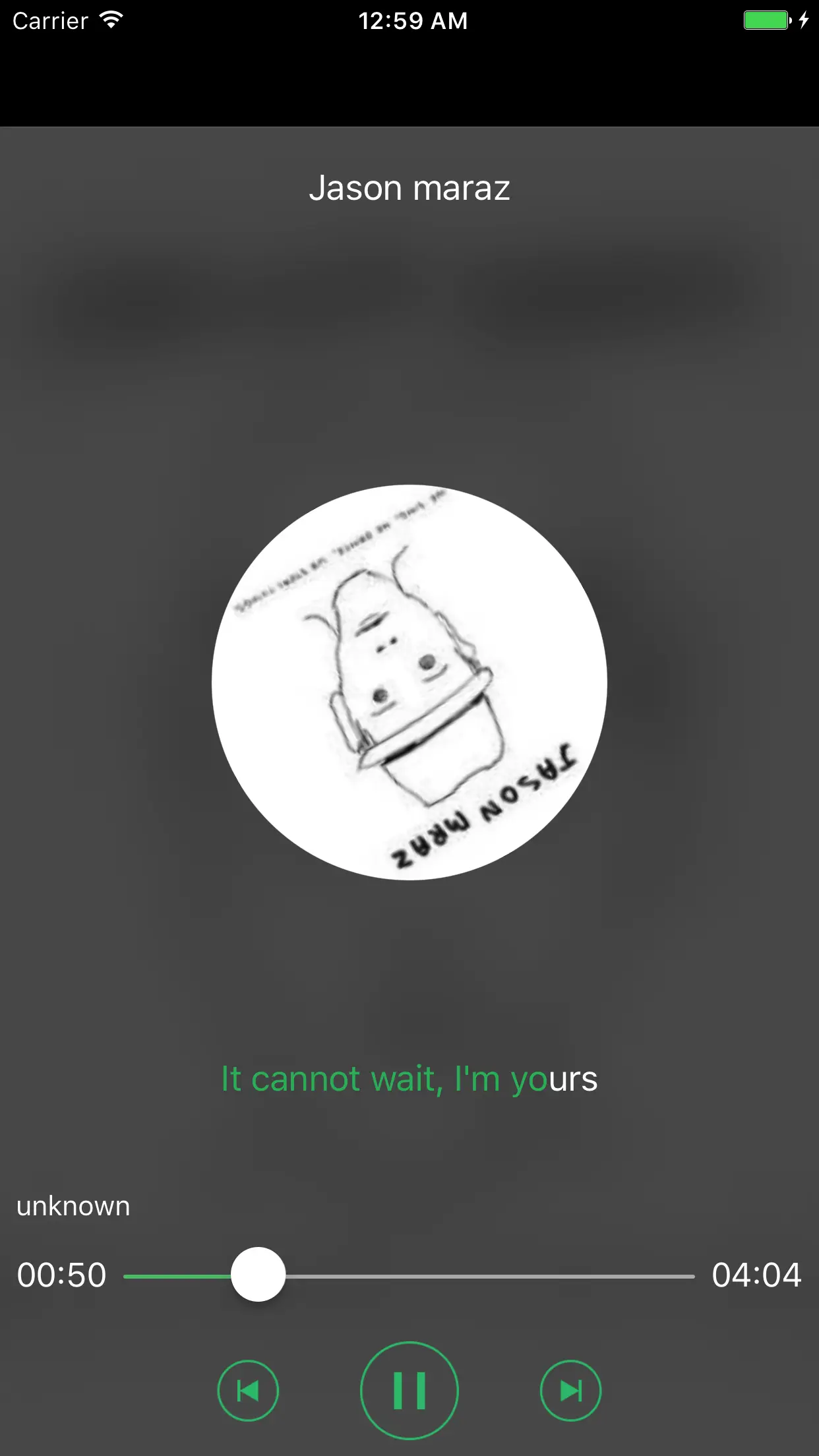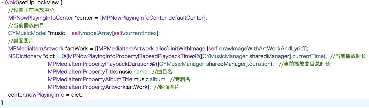 如果手机锁屏了,音频还在进行播放.再次点开屏幕时的视图即为锁屏视图.以上代码为笔者在项目中的实现代码.在设置封面图片时,为了能显示歌词,采取了绘制的方式(项目中的方法名:drawImageWithArtWorkAndLyric):先绘制指定大小的封面图片,再在指定rect下绘制歌词文字.如果锁屏视图中没有显示歌词的需求,可采用以下方式设置封面图片: