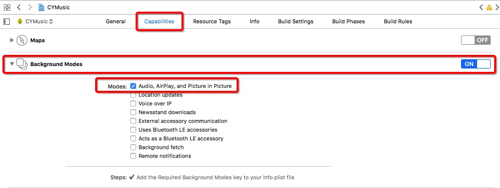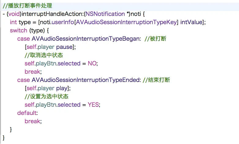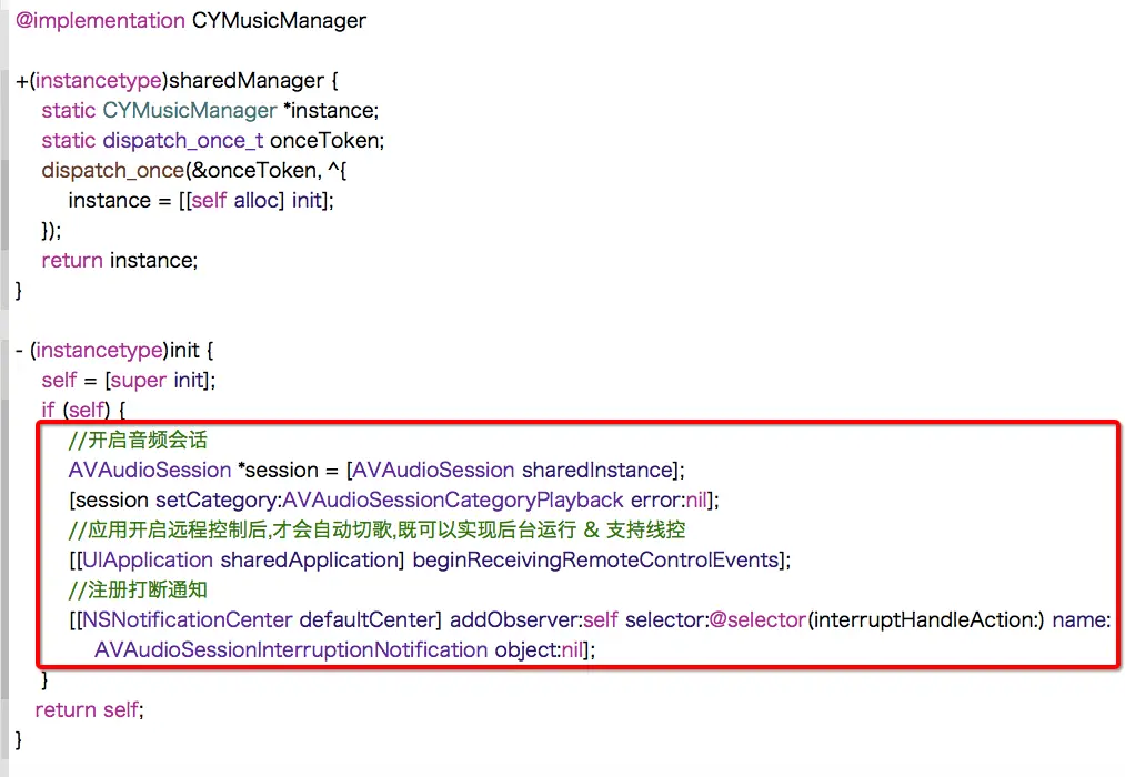 仅仅打开后台运行模式的话,在真机上进行后台播放时,只会持续几秒钟就会挂起,如果想要持续在后台运行模式下播放,还需要在音频管理单例的初始化方法中开启音频会话,代码如下: