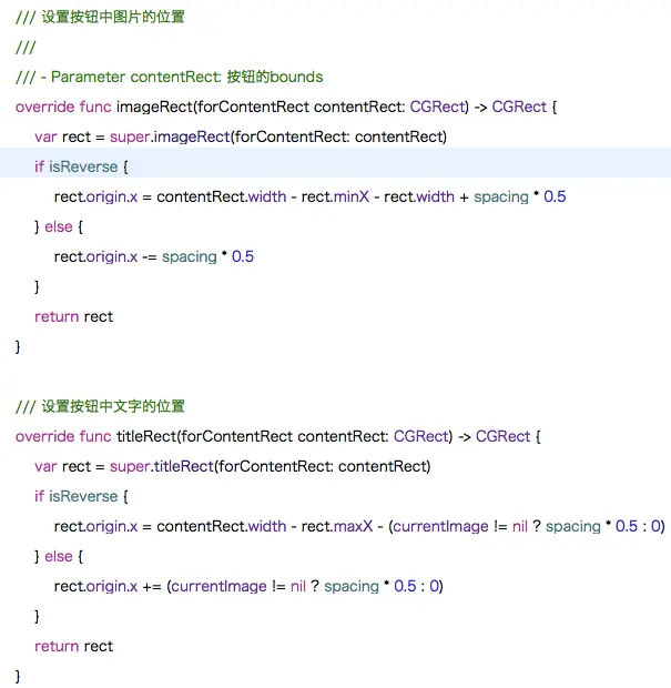 第二种和第三种方式都是通过重写UIButton的方法,来设置图片和文字在按钮上的位置以及他们之间的间距,非常简单: