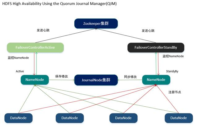 *Hadoop依赖Zookeeper进行各个模块的HA配置,其中状态为Active的节点对外提供服务,而状态为StandBy的节点则只负责数据的同步,在必要时提供快速故障转移。