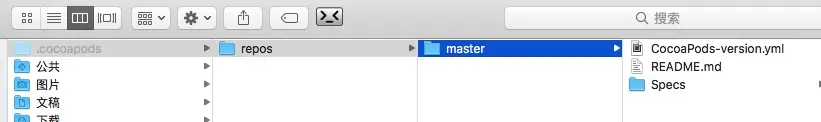 Spec Repo其实类似一个容器,里面装着所有的公开的Pods,当使用Cocoapods后,他就会被clone到本地的~/.cocoapods/repos目录下: