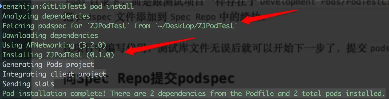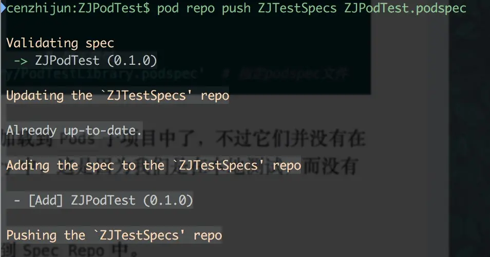 pod repo push ZJTestSpecs ZJPodPrivateTest.podspec #前面是本地Repo名字 后面是podspec名字