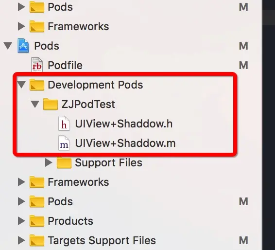 然后执行pod install命令安装,然后打开项目发现库文件已经被加载到Pods子项目中了,不过没有在Pods目录下,而是在Development Pods/ZJPodPrivateTest目录下,因为是本地测试项目,没有吧podspec文件添加到Spec Repo中的缘故