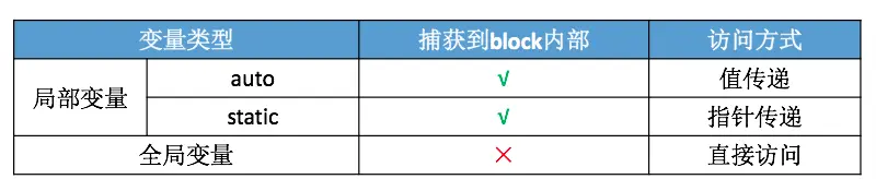 总而言之:在block内部访问的auto变量为值传递,局部静态变量为引用传递(也就是传递变量的指针)。