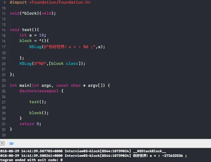 // 2018-08-28 21:34:33.276996+0800 Interview03-block[99340:9151961] 你好世界!a = : 10 ;