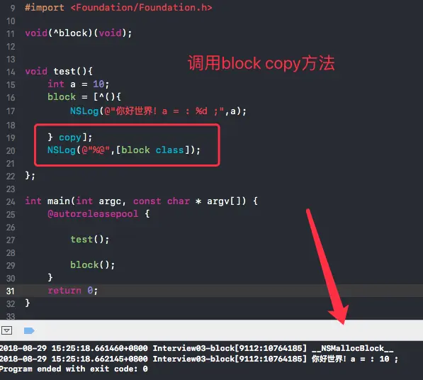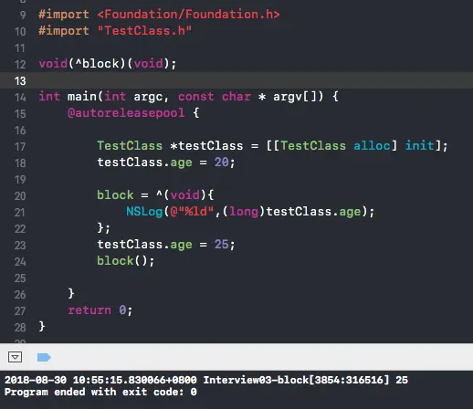 // 2018-08-28 23:16:53.245153+0800 Interview03-block[861:9731638] 你好世界!b = : 20 ;