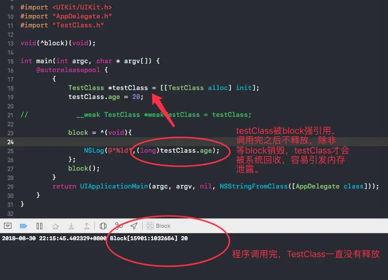 //2018-08-31 11:25:27.800865+0800 Block[74957:7622148] TestClass - dealloc