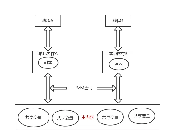 线程之间的共享变量存储在堆内存,每个线程都有私有的本地内存(线程栈),私有本地内存中存储了主内存中共享变量的拷贝,本地内存只是JMM的一个抽象概念,并不真实存在。