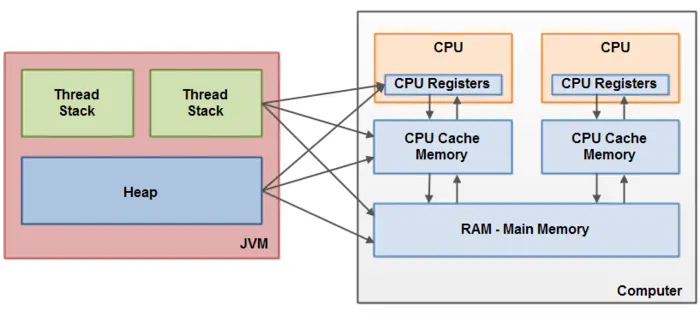 上面已经提到,Java内存模型与硬件内存架构之间存在差异。硬件内存架构没有区分线程栈和堆。对于硬件,所有的线程栈和堆都分布在主内中。部分线程栈和堆可能有时候会出现在CPU缓存中和CPU内部的寄存器中。如下图所示: