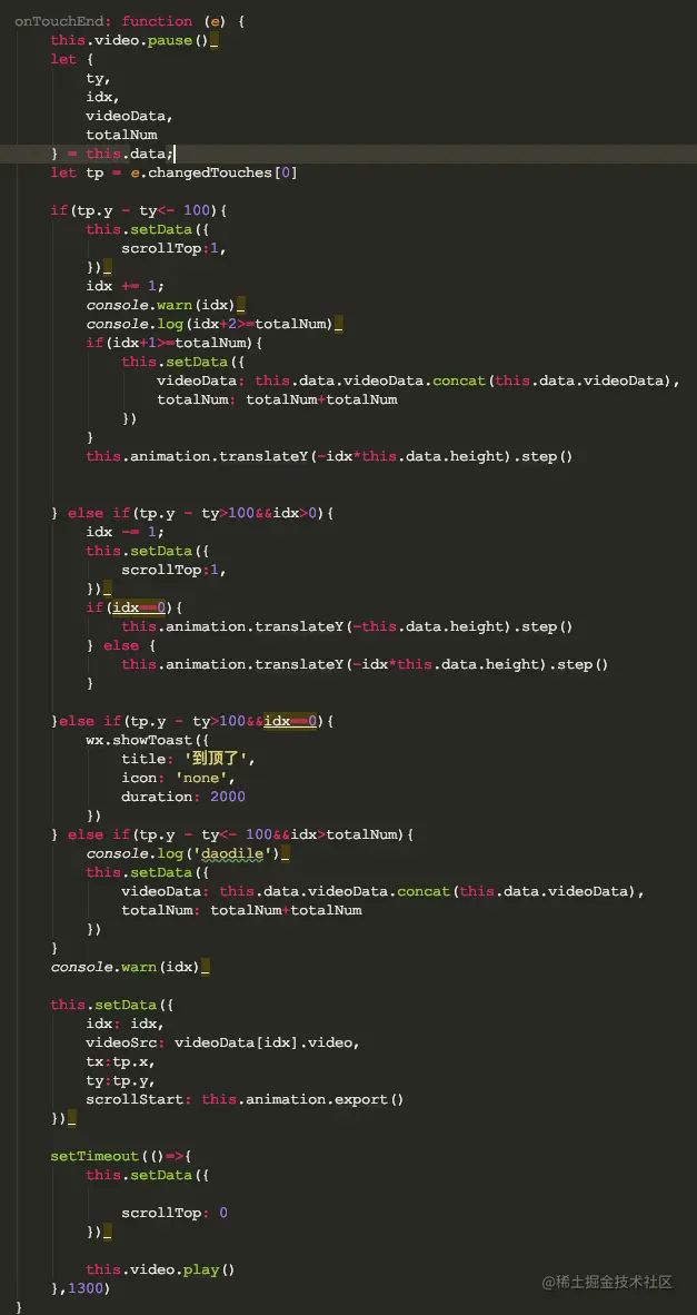 js主要做的是判断滚动方向,给wxml通过微信提供的animation方法来动态添加动画,这样就可以实现无限加载的需求了。scrollTop的作用是用来调整video标签位置,因为现在滚动的时候添加滚动的事视频的封面图不是视频本身,需要隐藏视频,假如用wx:if;哎控制的话,会导致视频隐藏在展现之后无法监听之前添加的事件。