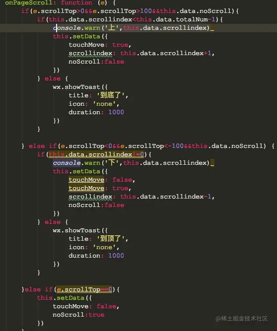 前面两种方法不行,我就采用了onPageScroll来监听页面是否发生滚动。这个方法会拿到当前页面在垂直方向已滚动的距离。scrollindex用来控制滚动,totalNum是滚动的总数,部分代码如下