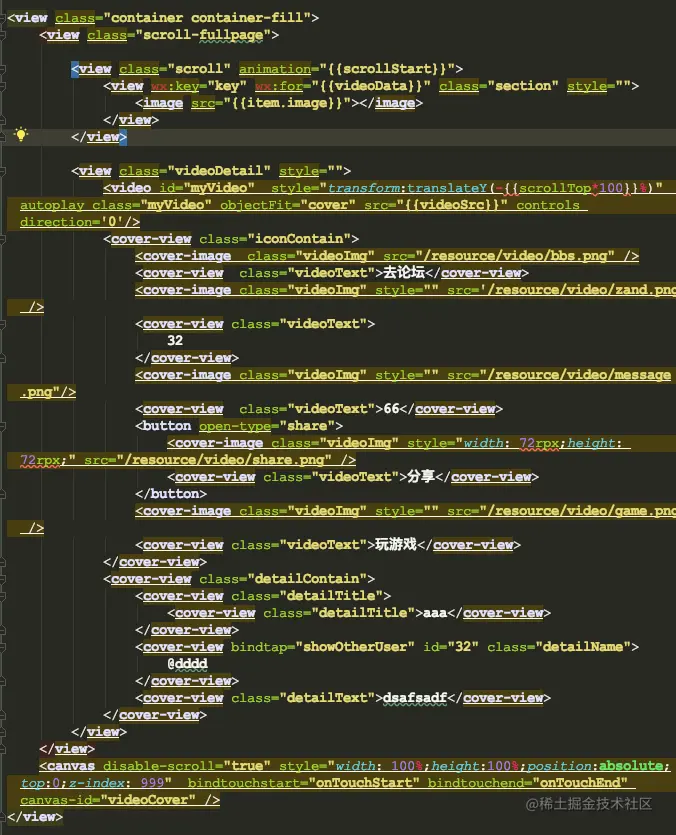 wxml:下面是wxml代码,主要思路就是让video宽高等于屏幕,点赞评论分享等功能,用cover-view定位到视频上方,在将canvas定位到video上面滚动时滚动的是封面图案,video标签只有一个,滚动更改video的src。