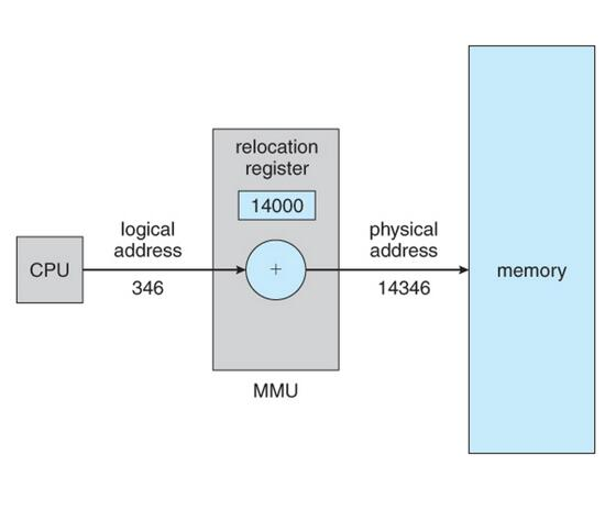 虚拟地址到物理地址的转换由存储器管理单元(MMU - Memory Management Unit)处理。MMU使用重定位寄存器(relocation register),其值在硬件级别上被添加到每个内存请求中。
