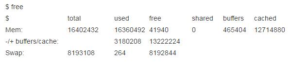 就是内核目前可以直接分配到,不需要额外的操作,即free命令第二行 Mem 的输出。从上例中可见,41940 + 16360492 = 16402432,也就是说Mem行的 free + used = total,注意,这里的free并不包括buffers和cached。