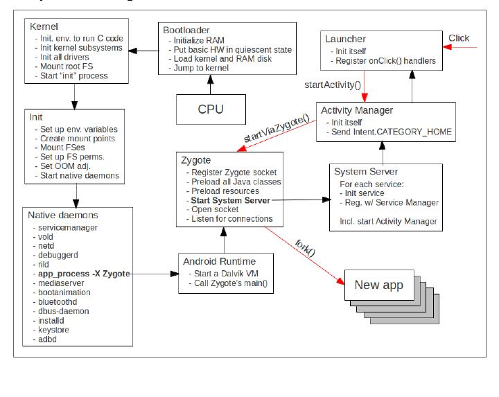 - 每个应用程序进程都是从名为Zygote的现有进程分叉(fork)出来的。 Zygote进程在系统引导并加载framework代码和资源(例如Activity Themes)时启动。 要启动新的应用程序进程,系统会fork Zygote进程,然后在新进程中加载并运行应用程序的代码。 这种方法允许在所有应用程序进程中共享大多数的为framework代码和资源分配的RAM页面。