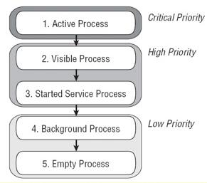 为了确定在内存不足时终止哪些进程,Android会根据进程中正在运行的组件以及这些组件的状态,将每个进程放入“重要性层次结构”中。必要时,系统会首先杀死重要性最低的进程,以此类推,以回收系统资源。这就相当于为进程分配了优先级的概念。