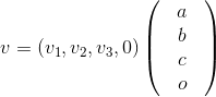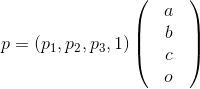从上面对向量和点的表达,我们可以看出为了在坐标系中表示一个点我们可以把点的位置看作是对于这个基的原点o所进行的一个位移,即一个向量p - o,我们在表达这个向量的同时用等价的方式表达出了点p: p = o + p1a + p2b + p3c(1-3)。(1-1),(1-3)是坐标系下表达一个向量和点的不同表达方式。这里可以看出,虽然都是用代数分量的形式表达向量和点,但表达一个点比一个向量需要额外的信息。如果我写一个代数分量表达(1,4,7),谁知道它是个向量还是一个点。我们现在把(1-1),(1-3)写成矩阵的形式: