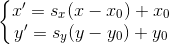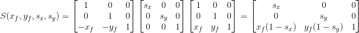 缩放、旋转变换都与参考点有关,上面进行的各种缩放、旋转变换都是以原点为参考点的。如果相对某个一般的参考点(xf,yf)作缩放、旋转变换,相当于将该点移到坐标原点处,然后进行缩放、旋转变换,最后将(xf,yf)点移回原来的位置。如关于(xf,yf)的缩放变换为: