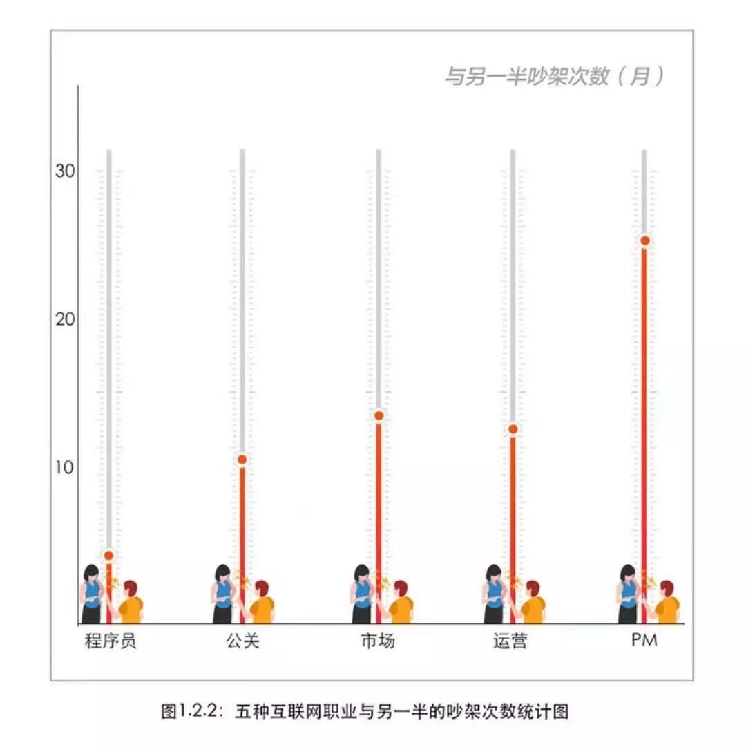在和伴侣的吵架次数上,报告显示:PM > 市场 > 运营 > 公关 > 程序员 。