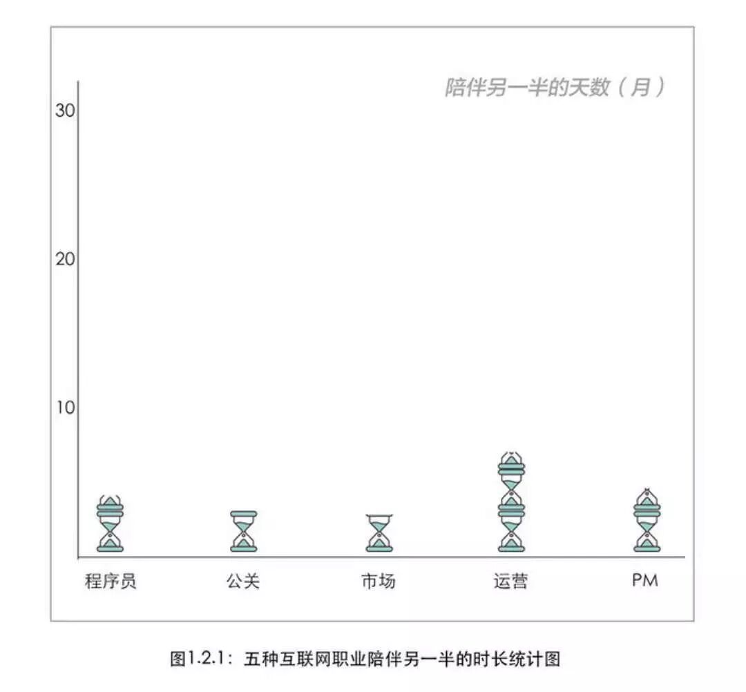 直接看上面的图表数据吧,在互联网从业者陪伴另一半的时长统计上,运营竟然是陪伴另一半的时间是最多的,高于其他职业。
