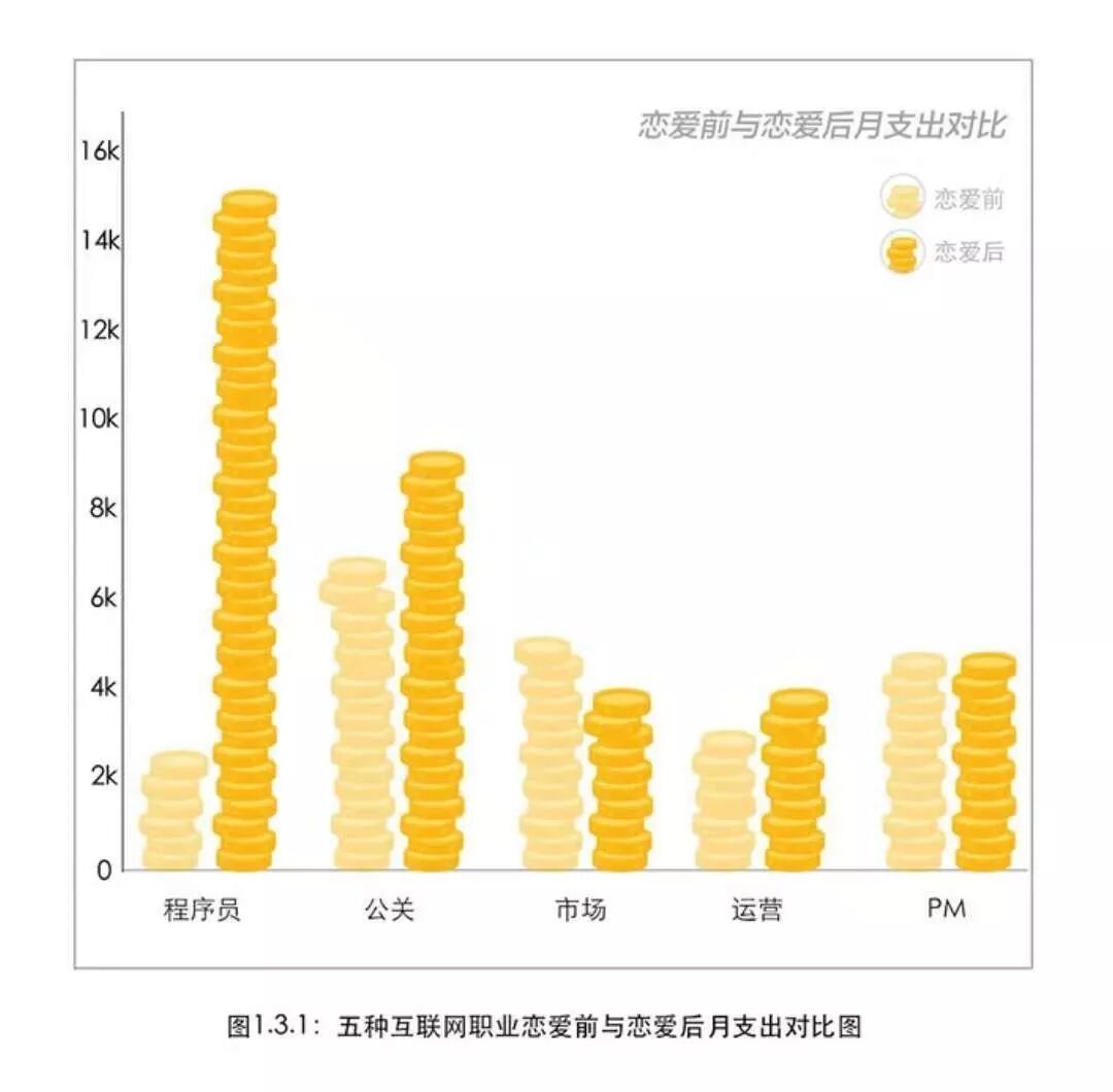 这又进一步的说明了一件事:我们程序员就是实在,就是疼女朋友,疼老婆。报告上竟然显示了一组奇怪的数据,做市场的人,恋爱的时候竟然比不恋爱的时候花的少了。他们竟然还美其名曰:控制预算已经成了一种习惯 。