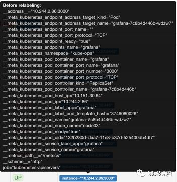 replace这个动作了,而是keep,就是只把符合我们要求的给保留下来,哪些才是符合我们要求的呢?我们可以把鼠标放置在任意一个 target 上,可以查看到Before relabeling里面所有的元数据,比如我们要过滤的服务是 default 这个 namespace 下面,服务名为 kubernetes 的元数据,所以这里我们就可以根据对应的__meta_kubernetes_namespace和