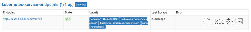 我们可以看到kubernetes-service-endpoints这一个任务下面只发现了一个服务,这是因为我们在 relabel_configs中过滤了 annotation 有prometheus.io/scrape=true的 Service,而现在我们系统中只有这样一个服务符合要求,所以只出现了一个实例。