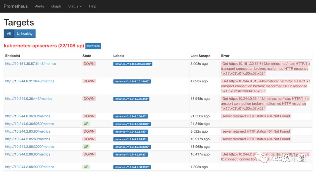 我们可以看到 kubernetes-apiservers 下面出现了很多实例,这是因为这里我们使用的是 Endpoints 类型的服务发现,所以 Prometheus 把所有的 Endpoints 服务都抓取过来了,同样的,上面我们需要的服务名为kubernetes这个 apiserver 的服务也在这个列表之中,那么我们应该怎样来过滤出这个服务来呢?还记得上节课的relabel_configs吗?没错,同样我们需要使用这个配置,只是我们这里不是使用