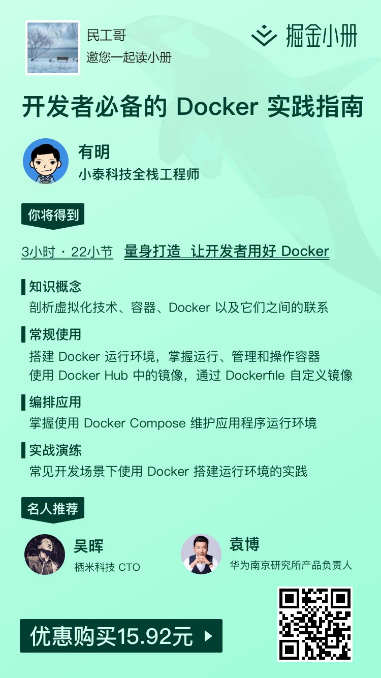 如果你正在入门或提高 Docker 的知识储备,一套系统性的教学远比散碎和层次不齐的文章要好得多,这本小册丰富的内容以集中的方式展现在你的眼前,将零碎的知识点梳理总结为知识体系和脉络。不论是将它作为你阅读的第一本 Docker 系列文集,还是把它当成提升自己知识储备的工具手册,都能带来不错的效果。