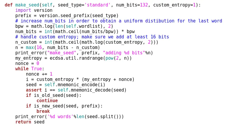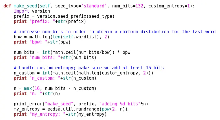 好了,现在我们知道如何生成种子,让我们看看种子生成器究竟做了什么。毕竟使用Electrum的所有人都必须依赖此代码的安全性和完整性,否则如果这些代码被写得很糟糕,你可能会损失所有的钱。因此,如果我们想在Electrum中存储大量比特币,我们必须100%信任此代码。那么让我们分析吧。