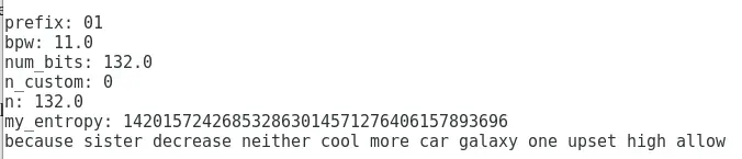 bwp(每个字的位数)变量取字列表长度的log2值,我的意思是那里有多少个单词,在这种情况下是英文列表:english.txt。英语列表中有2048个单词,其中log2为11。 - 然后将