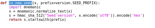 is_new_seed()函数,如果你现在生成一个种子,如果你以旧格式导入旧种子然后它进入旧函数。但是我上面执行的这段代码进入了新功能。这就是奇迹发生的地方。is_new_seed()函数实际位于bitcoin.py文件中: