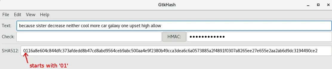 就是这样,这就是Electrum生成种子的基本方式。这个种子的HMAC-SHA512总和将从01开始,你甚至可以自己检查。所以在Linux中你可以安装一个名为GTKHash的工具来计算哈希值,所以让我演示一下,我们取种子,然后添加HMAC消息种子版本,如该函数所定义: