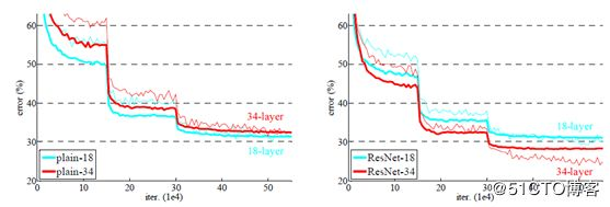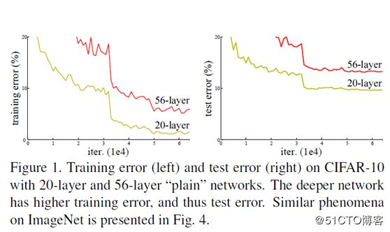 最初的CNN网络LeNet与AlexNet卷积层都比较少,VGG通过小的卷积核实现了网络深度的增加取得了显著效果,但是当层数过度增加的时候就发现训练错误与测试错误都在增加,图示如下: