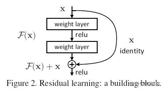 最开始人们以为是因为梯度消失或者梯度爆炸导致的,不过随着大家的努力,认为这个不是一个过拟合问题,而是网络褪化现象,所以针对这种情况,MSRA何凯明团队提出了一种新的网络模型-Residual Networks,其主要思想是使用残差结构来训练网络,一个残差结构如下: